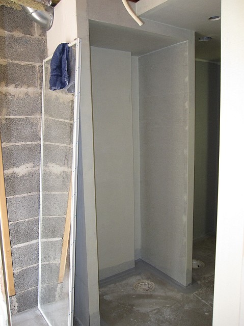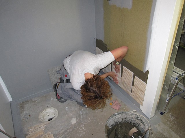 Målningen och kladdet i källaren blev klart, så då hann vi också med att få upp kaklet på väggarna. Planen var att hinan få upp glasmosaiken också, men det sket sig.