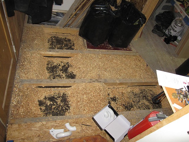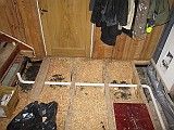 Byggde vidare på den svåra lådan och kom till slut fram till att golvet i hallen måste fixas först. Började bryta bort några brädor.